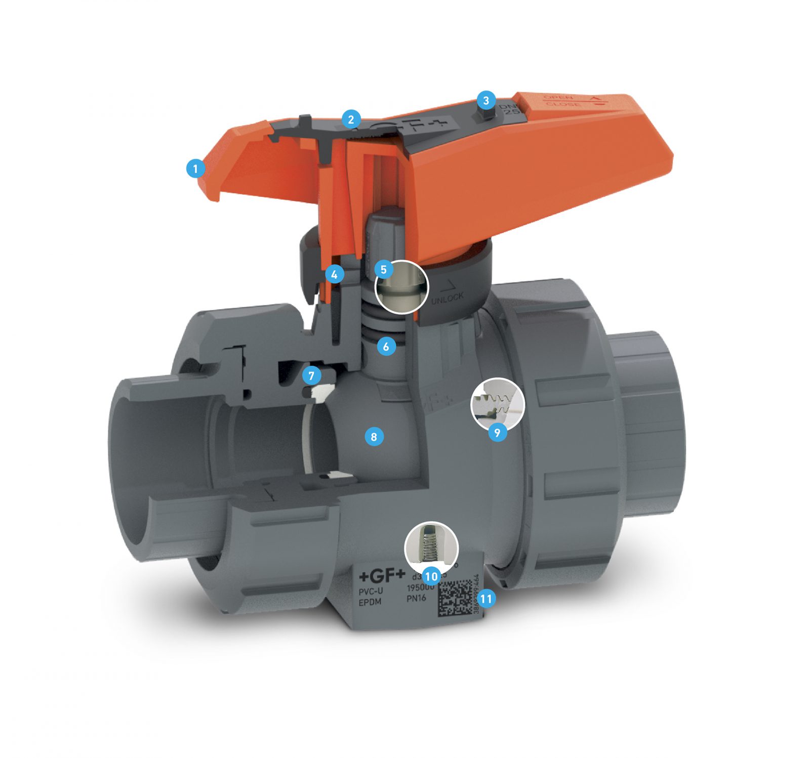 شیر گازی UPVC جورج فیشر کد 546 (GEORG FISCHER) یا همان شیر توپی یوپیویسی جورج فیشر تولید کشور سوئیس است. قیمت شیر گازی یوپیویسی جورج فیشر بسته به سایز و متریال تولید ان متغییر میباشد. شیر توپی جورج فیشر از سایز 2/1 تا 4 اینچ با 3 اتصال دندهای و چسبی و فلنج دار تولید میگردد. متریل تولید شیر ربع گرد جورج فیشر سویس از مواد پلاستیک بدون بو و مزه فشرده شده میباشد که مقاومت بالایی در برابر خورندگی و زنگ زدگی دارد.